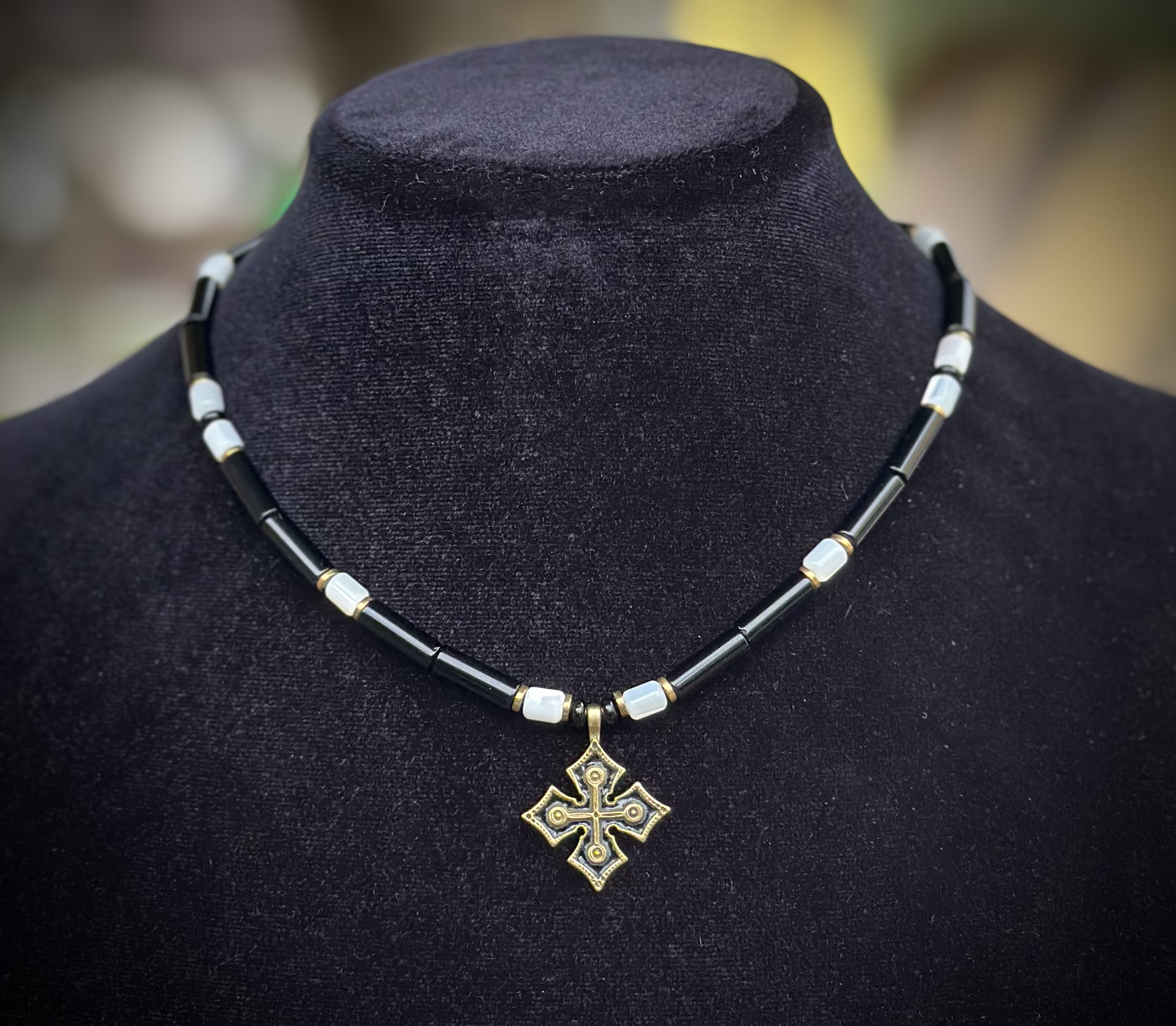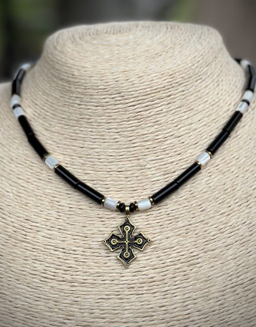 Онікс, перламутр, підвіска – латунь, оздоблена ювелірною емаллю від українських майстрів. Довжина 39 см, подовжувач 5 см.