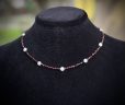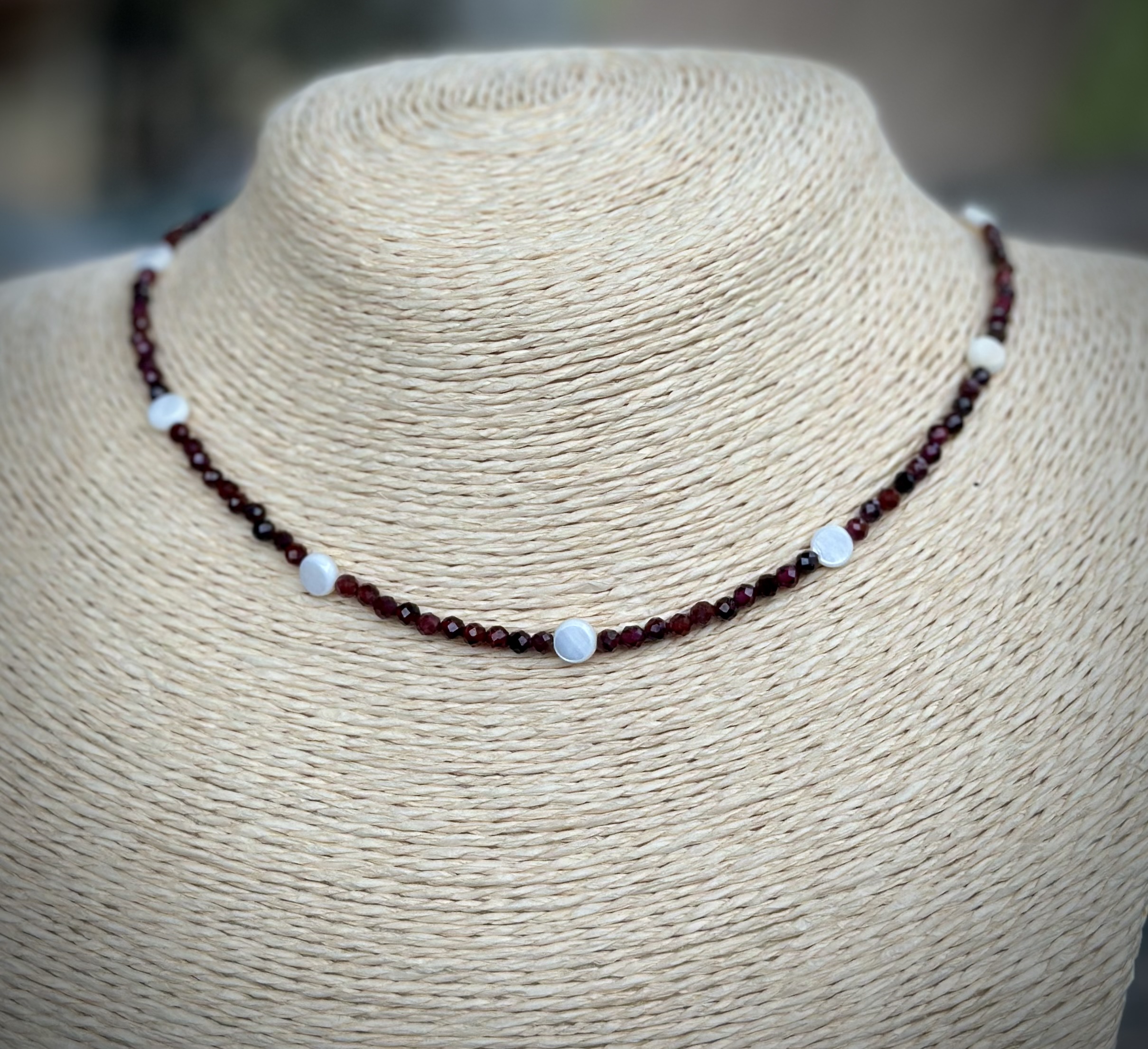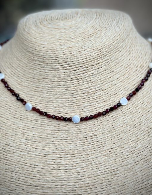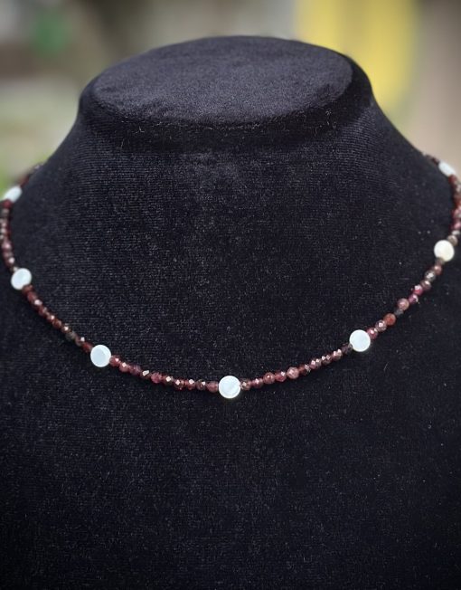 Поєднання теплого гранованого штучного гранату і прохолодного плескатого перламутру. Довжина 39 см, подовжувач 5 см.