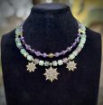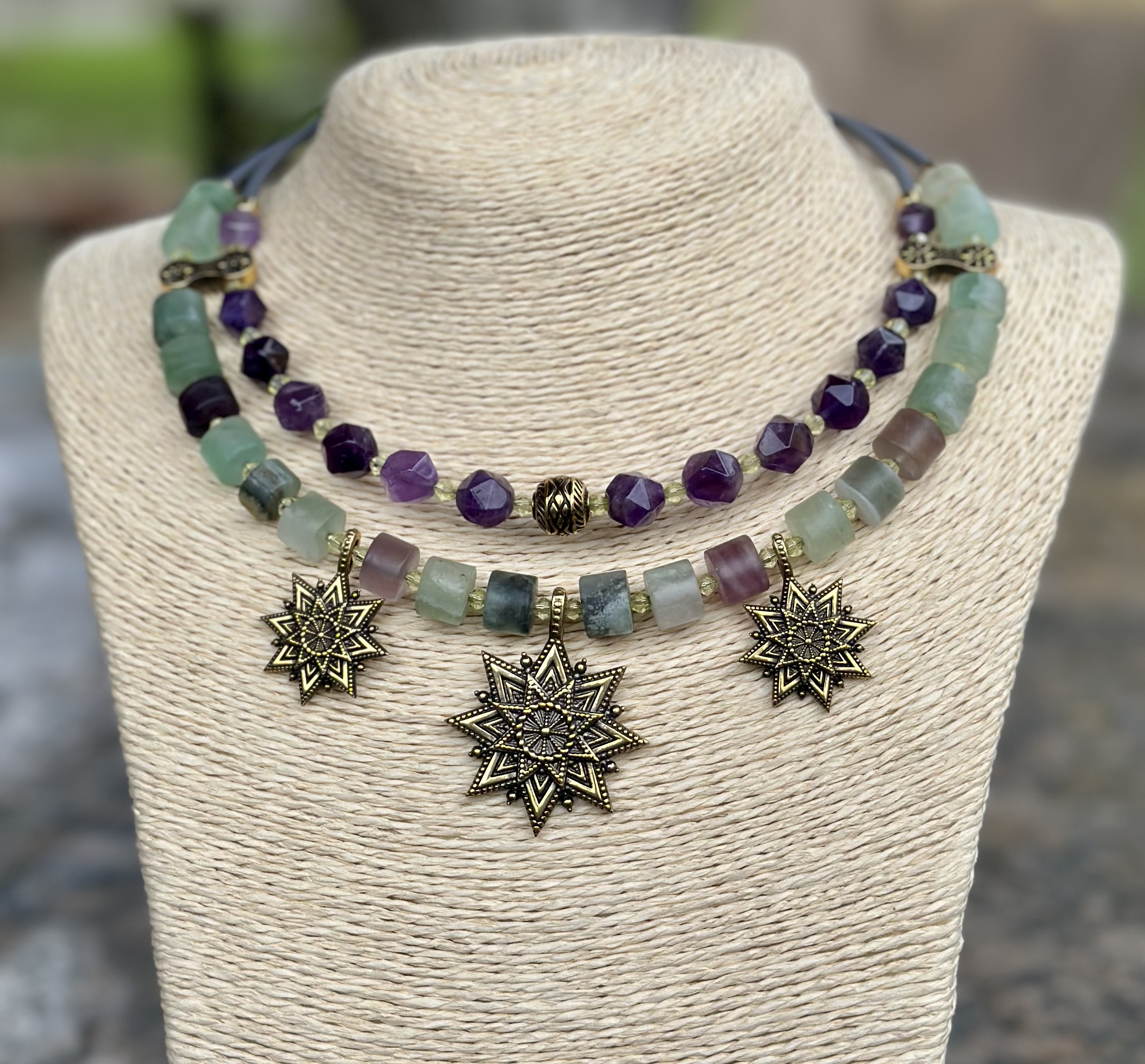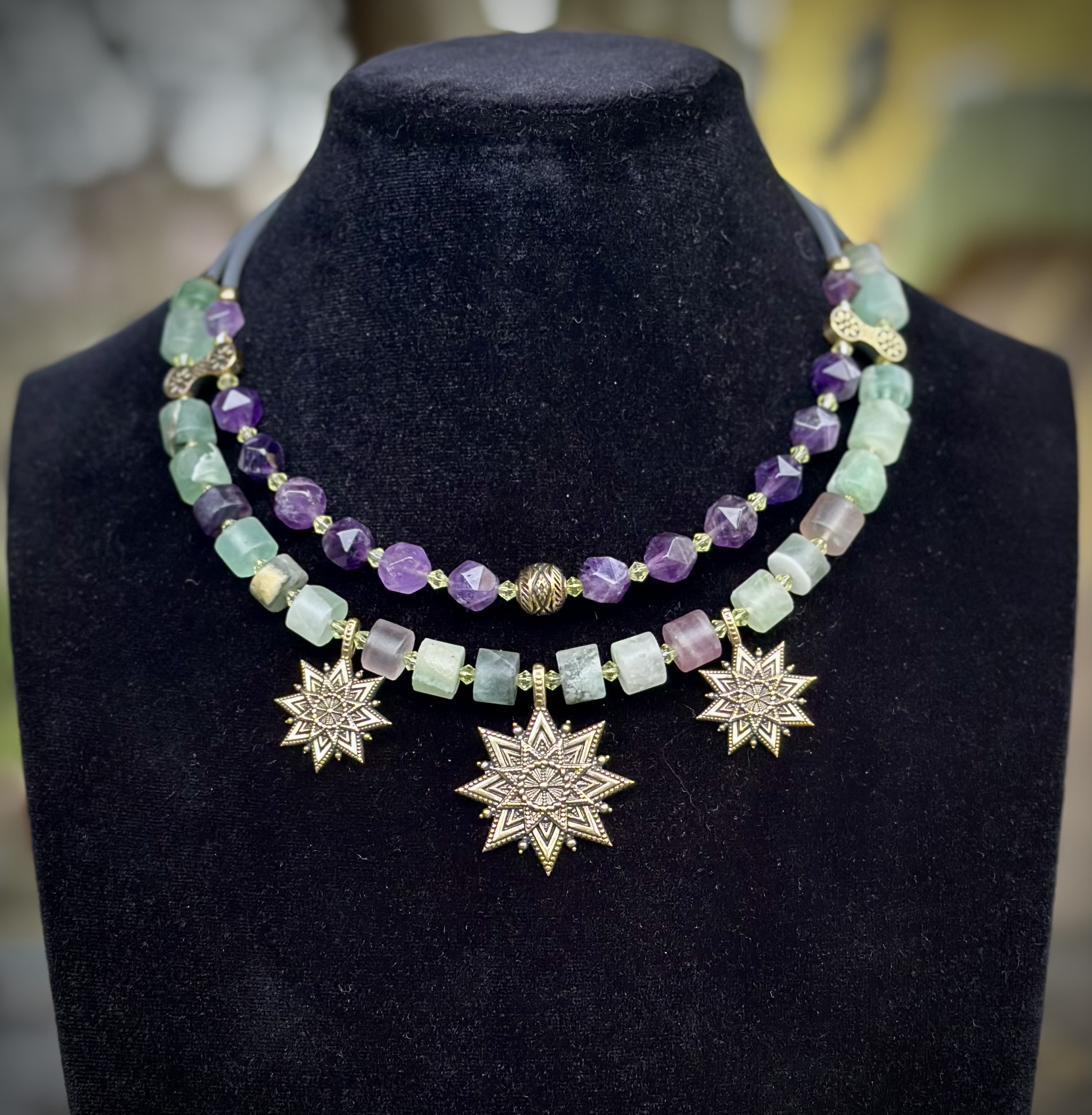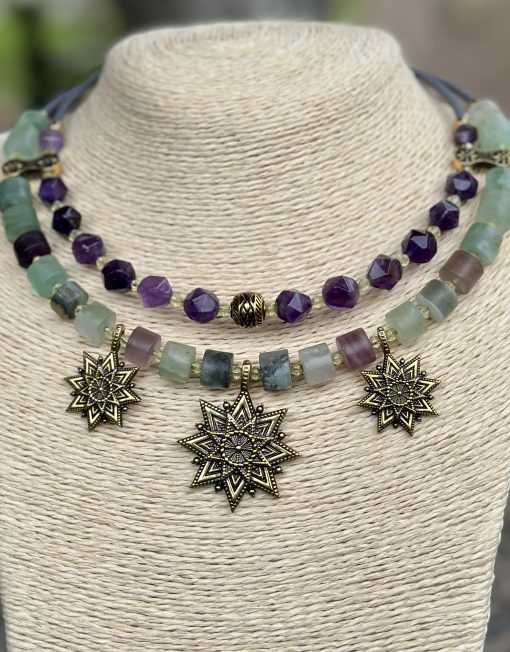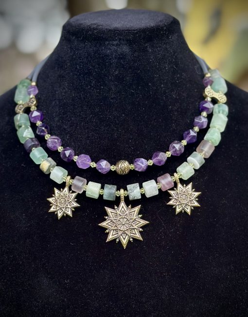 Намисто виготовлене з флюориту та аметисту. Намистини, підвіси та защіпка – латунь, ручна робота українських майстрів. Довжина коротшої низки 40 см.